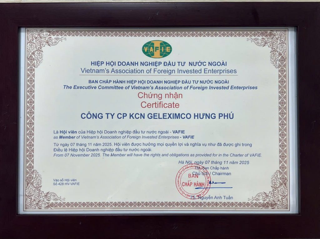 Tại sự kiện, ông Nguyễn Anh Tuấn – Chủ tịch Hiệp hội Doanh nghiệp Đầu tư Nước ngoài đã trực tiếp trao Giấy chứng nhận Hội viên mới cho các doanh nghiệp gia nhập Hiệp hội và Công ty Cổ phần KCN GELEXIMCO Hưng Phú. Việc đón nhận Giấy chứng nhận là sự ghi nhận chính thức của Hiệp hội đối với KCN Hưng Phú, đồng thời thể hiện niềm tin và kỳ vọng vào vai trò, đóng góp tích cực của doanh nghiệp trong cộng đồng các nhà đầu tư nước ngoài tại Việt Nam.